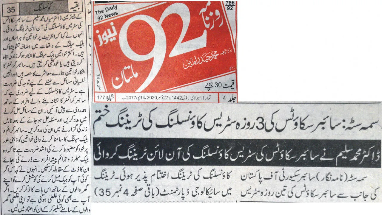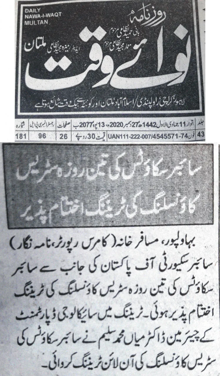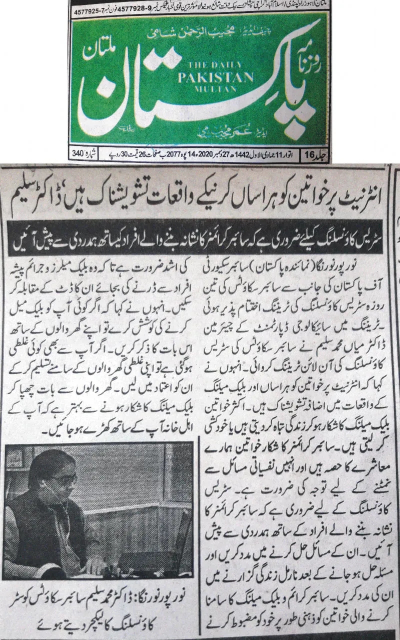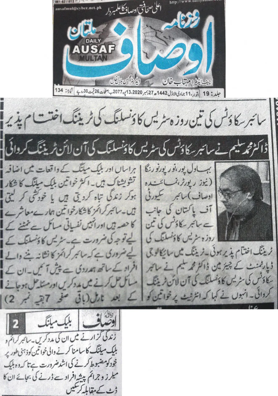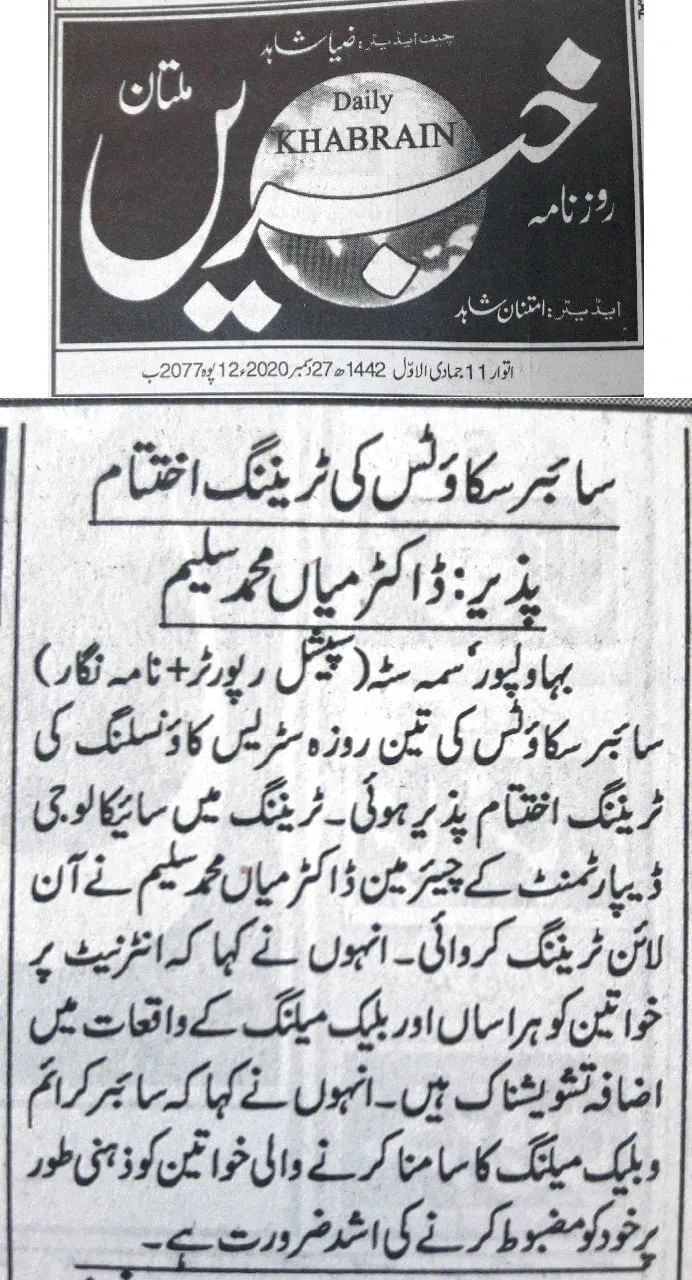 The training was conducted by Dr. Muhammad Saleem, Chairman of the Department of Psychology at The Islamia University of Bahawalpur (IUB), and focused on equipping counselors and Cyber Scouts with practical skills to support victims of cyber harassment and digital abuse.