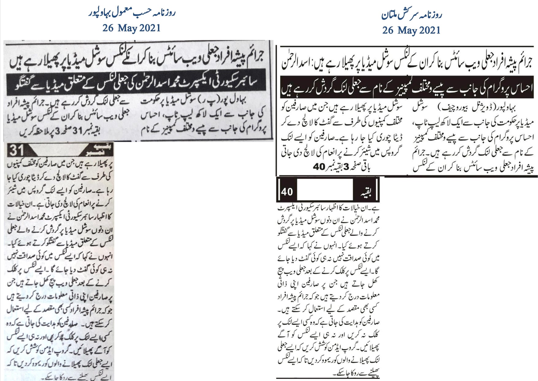 سوشل میڈیا پر حکومت کی جانب سے ایک لاکھ لیپ ٹاپ، احساس پروگرام کی جانب سے پیسے و مختلف کمپینیز کے نام سے جعلی لنک گردش کررہے ہیں۔جرائم پیشہ افراد جعلی ویب سائٹس بنا کر ان کے لنکس سوشل میڈیا پر پھیلا رہے ہیں جن میں صارفین کو مختلف کمپنیوں کی طرف سے گفٹ کا لالچ دے کر ڈیٹا چوری کیا جا رہا ہے۔صارفین کو ایسے لنک گروپس میں شیئر کرنے پر انعام کی لالچ دی جاتی ہے۔ان خیالات کا اظہار سائبر سکیورٹی ایکسپرٹ محمد اسد الرحمن نے ان دنوں سوشل میڈیا پر گردش کرنے والے جعلی لنکس کے متعلق میڈیا سے گفتگو کرتے ہوئے کیا۔ انہوں نے کہا کہ ایسے لنکس میں کوئی صداقت نہیں نہ ہی کوئی گفٹ دیا جائے گا۔ایسے لنکس پر کلک کرنے کے بعد جعلی ویب پیج کھل جاتے ہیں جن پر صارفین اپنی ذاتی معلومات درج کر دیتے ہیں جو کہ جرائم پیشہ افراد کسی بھی مقصد کے لیے استعمال کر سکتے ہیں۔ صارفین کو ہدایت کی جاتی ہے کہ وہ کسی ایسے لنک پر کلک نہ کریں اور نہ ہی ایسے لنکس کو آگے پھیلائیں۔ گروپ ایڈمن کوشش کریں کہ ایسے جعلی لنک پھیلانے والوں کو ریموو کر دیں تا کہ ایسے لنکس پھیلنے سے روکا جا سکے۔