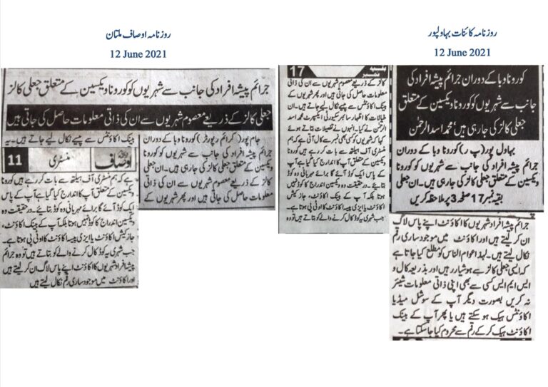 کورونا وبا کے دوران جرائم پیشہ افراد کی جانب سے شہریوں کو کورونا ویکسین کے متعلق جعلی کالز کی جارہی ہیں۔ان جعلی کالز کے ذریعے معصوم شہریوں سے ان کی ذاتی معلومات حاصل کی جاتی ہیں اور پھر شہریوں کے بینک اکاؤنٹس سے پیسے نکال لیے جاتے ہیں۔ان خیالات کا اظہار سائبر سکیورٹی ایکسپرٹ محمد اسد الرحمن نے کیا۔ انہوں نے تفصیلات بتاتے ہوئے کہا کہ شہریوں کو کسی بھی نمبر سے کال آتی ہے کہ ہم منسٹری آف ہیلتھ سے با ت کر رہے ہیں کورونا ویکسین کے متعلق آپ کا اندارج کیا گیا ہے آپ کے پاس ایک کوڈ آئے گا برائے مہربانی وہ کوڈ بتائیے۔در حقیقت وہ ویکسین اندراج کا کوڈ نہیں ہوتا بلکہ آ پ کے بینک اکاؤنٹ، جاز کیش اکاؤنٹ یا ایزی پیسہ اکاؤنٹ کا او ٹی پی ہوتا ہے۔ جب شہری یہ کوڈ کال کرنے والے کو بتاتے ہیں تو وہ جرائم پیشہ افراد شہریوں کا اکاؤنٹ اپنے پاس لاگ ان کر لیتے ہیں اور اکاؤنٹ میں موجود ساری رقم نکال لیتے ہیں۔ لہذا عوام الناس کو مطلع کیا جاتا ہے کہ ایسی جعلی کالز سے ہوشیار رہیں اور بذریعہ کال و ایس ایم ایس کسی سے بھی اپنی ذاتی معلومات شیئر نہ کریں بصورت دیگر آپ کے سوشل میڈیا اکاؤنٹس ہیک ہو سکتے ہیں یا پھر آپ کے بینک اکاؤنٹ ہیک کر کے رقم سے محروم کیا جا سکتا ہے۔