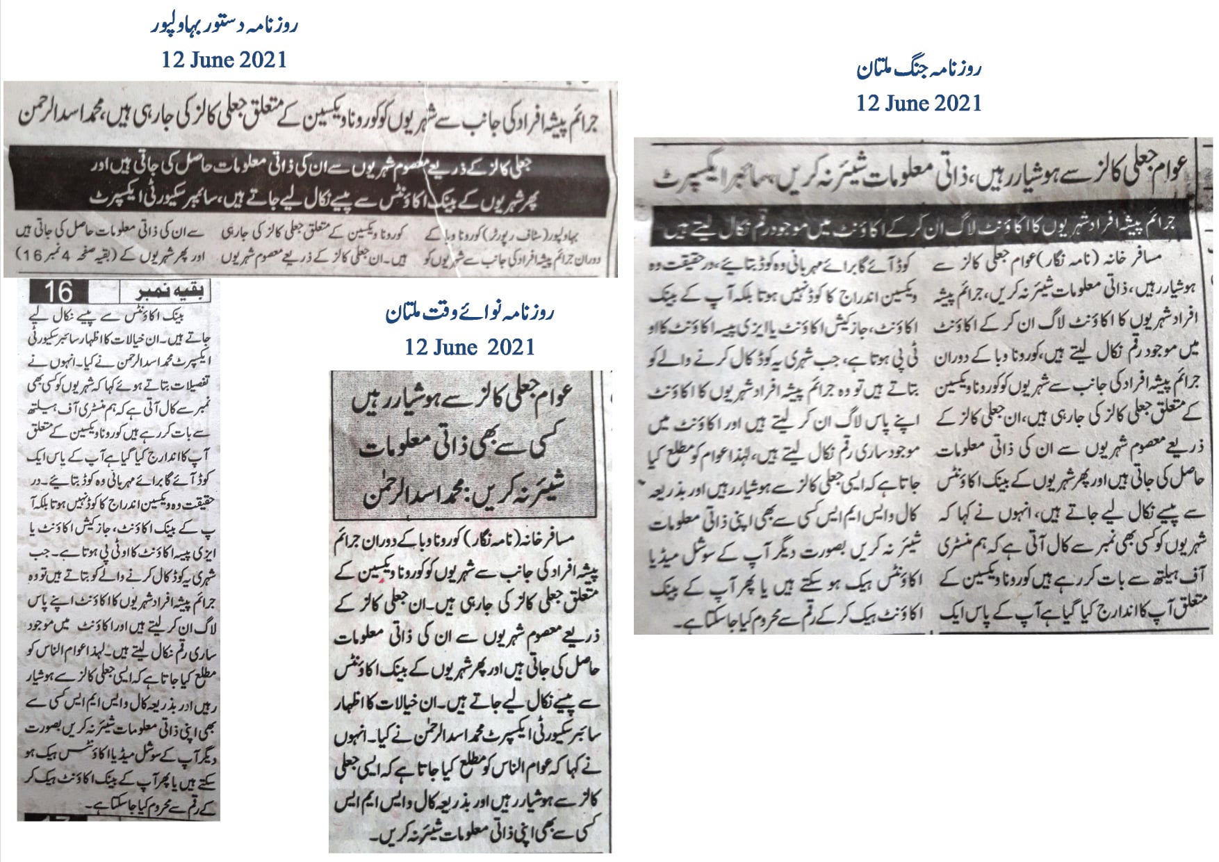 کورونا وبا کے دوران جرائم پیشہ افراد کی جانب سے شہریوں کو کورونا ویکسین کے متعلق جعلی کالز کی جارہی ہیں۔ان جعلی کالز کے ذریعے معصوم شہریوں سے ان کی ذاتی معلومات حاصل کی جاتی ہیں اور پھر شہریوں کے بینک اکاؤنٹس سے پیسے نکال لیے جاتے ہیں۔ان خیالات کا اظہار سائبر سکیورٹی ایکسپرٹ محمد اسد الرحمن نے کیا۔ انہوں نے تفصیلات بتاتے ہوئے کہا کہ شہریوں کو کسی بھی نمبر سے کال آتی ہے کہ ہم منسٹری آف ہیلتھ سے با ت کر رہے ہیں کورونا ویکسین کے متعلق آپ کا اندارج کیا گیا ہے آپ کے پاس ایک کوڈ آئے گا برائے مہربانی وہ کوڈ بتائیے۔در حقیقت وہ ویکسین اندراج کا کوڈ نہیں ہوتا بلکہ آ پ کے بینک اکاؤنٹ، جاز کیش اکاؤنٹ یا ایزی پیسہ اکاؤنٹ کا او ٹی پی ہوتا ہے۔ جب شہری یہ کوڈ کال کرنے والے کو بتاتے ہیں تو وہ جرائم پیشہ افراد شہریوں کا اکاؤنٹ اپنے پاس لاگ ان کر لیتے ہیں اور اکاؤنٹ میں موجود ساری رقم نکال لیتے ہیں۔ لہذا عوام الناس کو مطلع کیا جاتا ہے کہ ایسی جعلی کالز سے ہوشیار رہیں اور بذریعہ کال و ایس ایم ایس کسی سے بھی اپنی ذاتی معلومات شیئر نہ کریں بصورت دیگر آپ کے سوشل میڈیا اکاؤنٹس ہیک ہو سکتے ہیں یا پھر آپ کے بینک اکاؤنٹ ہیک کر کے رقم سے محروم کیا جا سکتا ہے۔