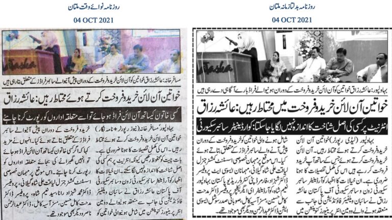 During an event organized by the Saiban Welfare Foundation for women entrepreneurs, the Coordinator of Cyber Security Zone and Cyber Security of Pakistan, Ayesha Razzaq, advised women participating in online buying and selling to be cautious. She emphasized the importance of having complete details about the person you are dealing with online, as it is impossible to ascertain someone’s true identity on the internet. She highlighted the need for women to keep records of their conversations while engaging in online transactions to have evidence in case of any fraud. Furthermore, she advised that if a woman falls victim to online fraud, she should not panic but report the incident to the relevant authorities for investigation and legal action. The event was attended by distinguished guests including Assistant Commissioner General Liaquat Ali Shah Gilani, Associate Professor Dr. Muhammad Shahzad Rana, former Deputy Controller Radio Pakistan Bahawalpur Syed Naeem Shah, Coordinator e-Agriculture Professor Dr. Madhat Kamil Hussain, Chairman Saiban Welfare Foundation Mrs. Asia Kamal, Provincial President Pakistan Social Association Dr. Abdul Rahman Nasir, and others.