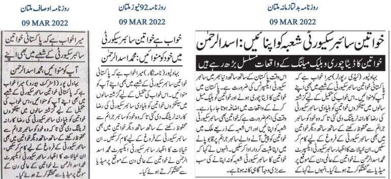 Cybersecurity expert Muhammad Asad Ul Rehman has expressed his dream for Pakistani women to make their mark in the field of cybersecurity. To fulfill this dream, hundreds of women have been provided with voluntary training in basic cybersecurity over the past years, enabling them to protect themselves against cybercrimes and work towards promoting cybersecurity awareness among other women. He shared these thoughts on the occasion of International Women’s Day during a conversation with the media. He highlighted the global demand for cybersecurity experts, including Pakistan, where incidents of data theft and blackmailing women are on the rise. Women must embrace the cybersecurity sector and play a positive role in controlling cyber crimes against women in the country. He pointed out that the lack of awareness is the biggest barrier preventing women from entering this field. There’s a need to educate women about the necessity, benefits, and opportunities offered by the cybersecurity sector.