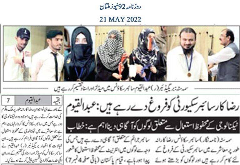 Cyber Scouts are voluntarily working to promote cybersecurity in society and raising awareness about the increasing cybercrimes, leading to a growing consciousness among people about the safe use of the internet. Since the creation of Pakistan, the youth have voluntarily been serving the country and the nation. In the current era of technology, the role of Cyber Scouts is extremely important as they provide awareness about the safe use of technology in society. These views were expressed by Brigadier (Retd) Abdul Qayyum during the distribution of medals and certificates to Cyber Scouts in recognition of their services. According to the details, after the establishment of Pakistan, the 93rd All Pakistan Social Workers Conference was organized by the Pakistan Social Association founded by Quaid-e-Azam, where social workers from all over Pakistan were honored with honorary certificates and medals. On this occasion, Cyber Scouts Asif Jameel, Ayesha Razaq, Saba Nawaz, Sidra Arshad, Furman Allah, Abdul Rahman were awarded medals, while Ghulam Murtaza, Faza Javed, Qurratulain, Saba Munir, Sundas Jabeen Mirza, Sajid Hanif, Umar Shehzad, Muhammad Hamza, Muhammad Shayan, Shahzad Ahmad were given honorary certificates.