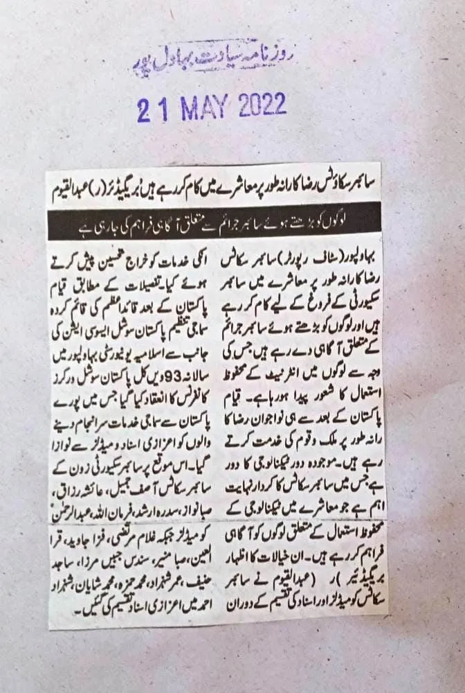 Under the CSOP (CSR initiative of CS Zone Pvt. Limited), a prestigious ceremony was held to confer Medal Awards for Outstanding Voluntary Service upon our dedicated Cyber Scouts. In recognition of their relentless contributions to cybersecurity awareness and community safety, scouts Asif Jameel, Ayesha Razzaq, Saba Nawaz, Sidra Arshad, Nawal Mehdi, Farman Ullah, and Abdul Rehman were honored for their exemplary service.